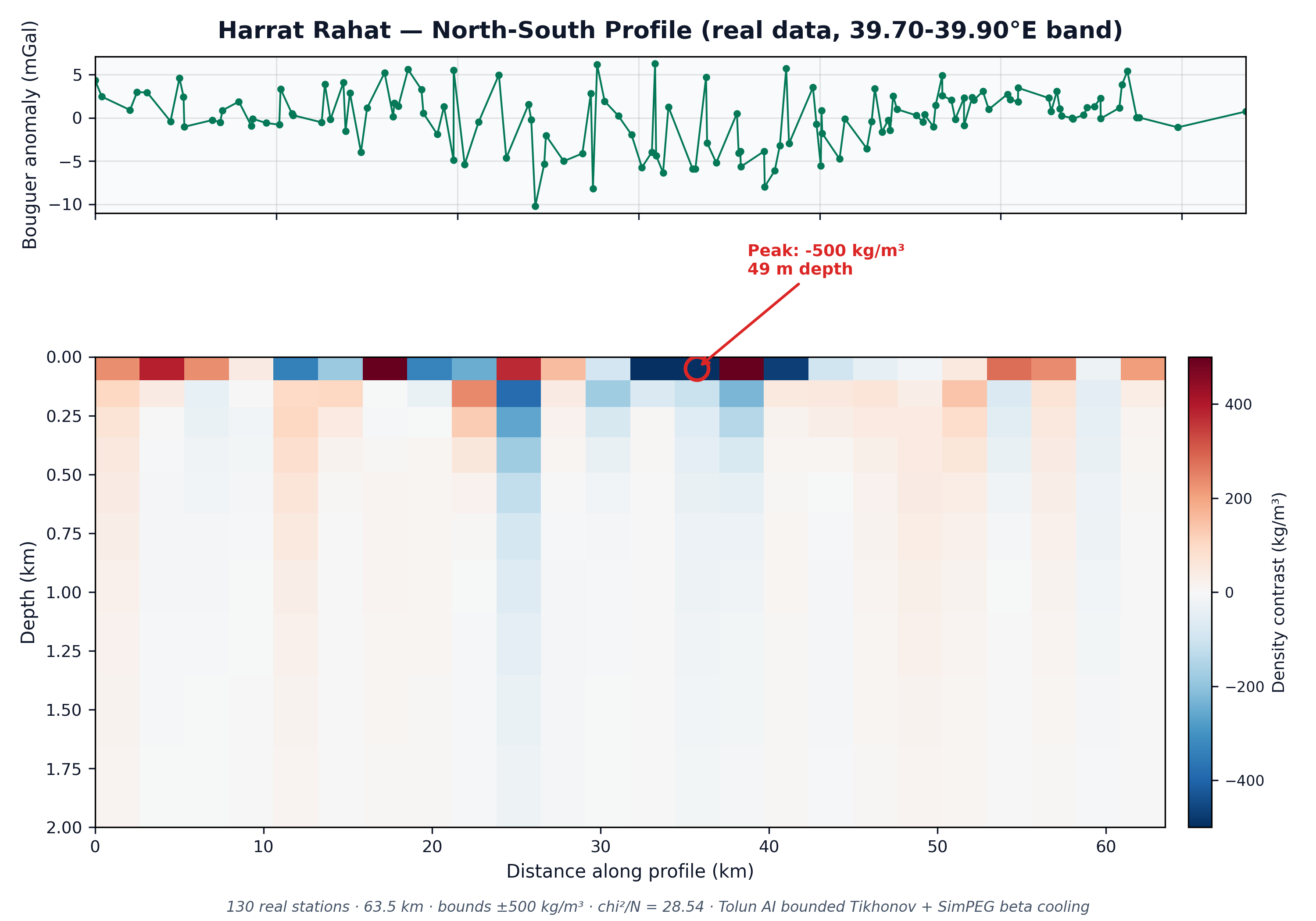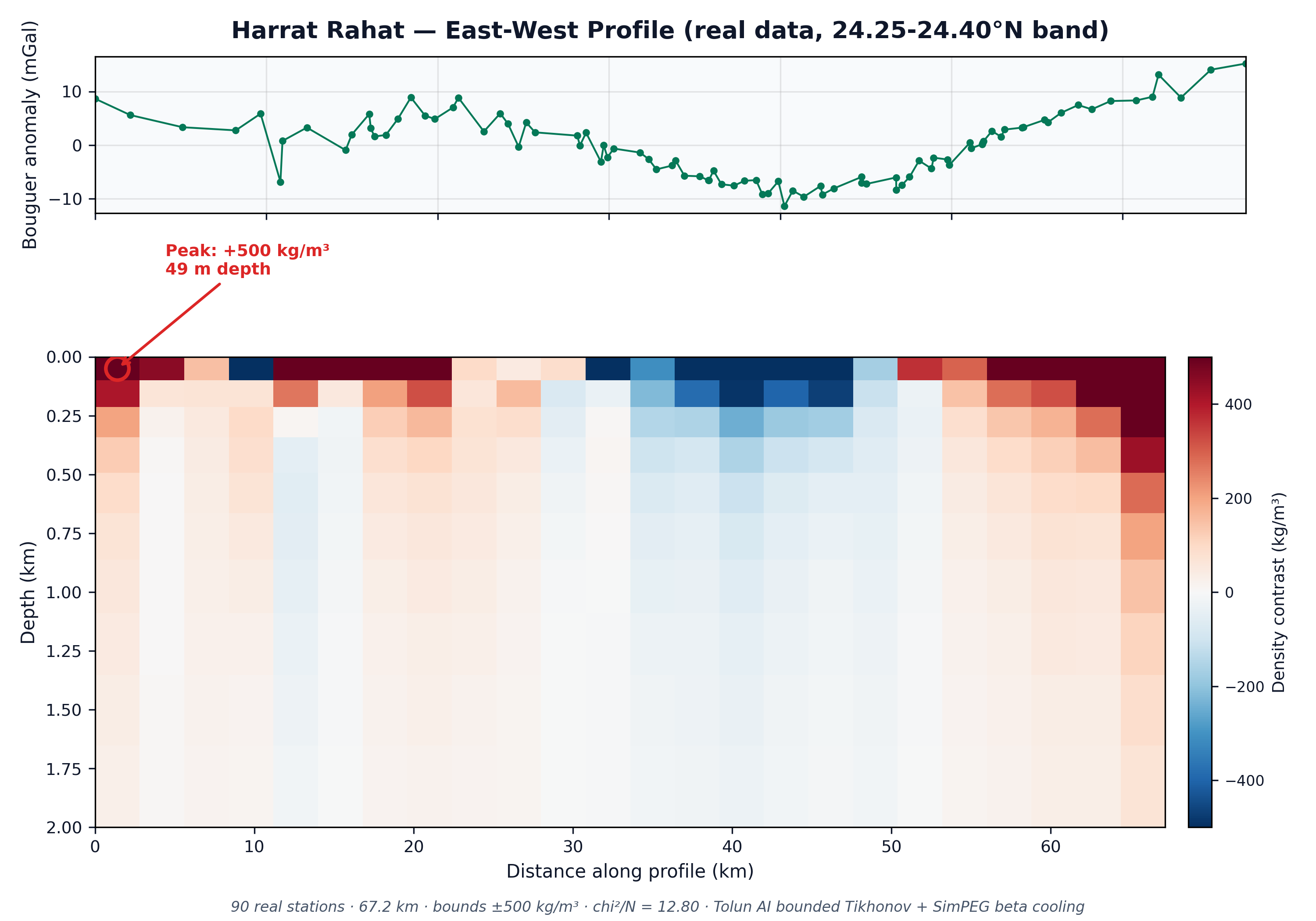 The two Harrat Rahat cross-sections above are live outputs from our production engine on real SGS/USGS public gravity data — same pipeline that runs on your licensed survey data. Full case study PDF available on request.